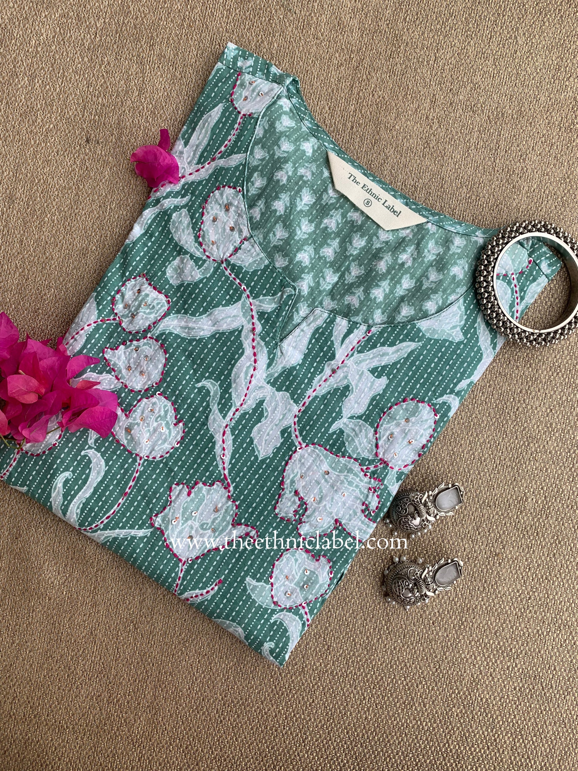 "Aabha" Green Kantha Cotton kurta - S