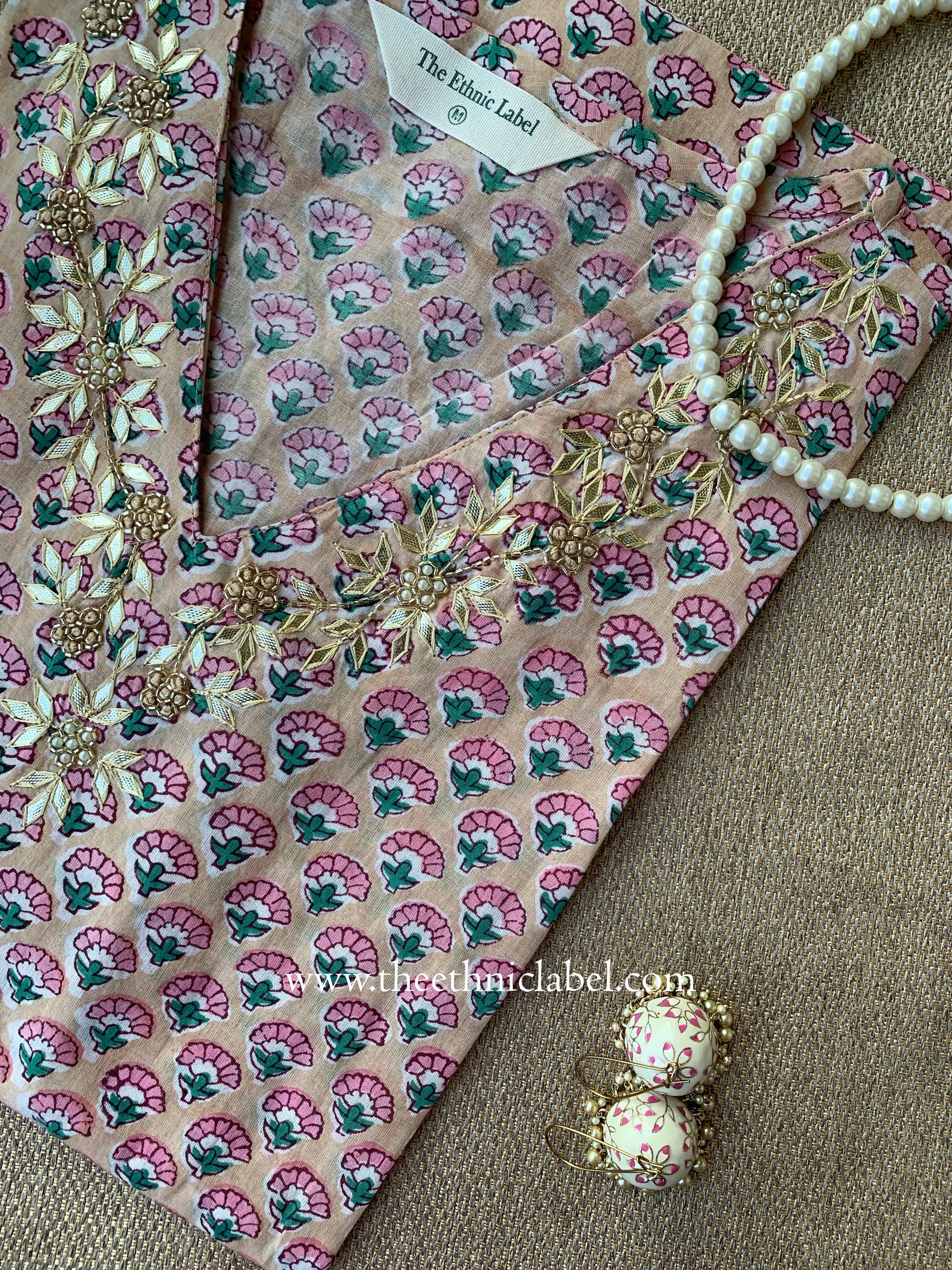 "Khidmat" Hand Embroidered Block Printed Peach Cotton kurta