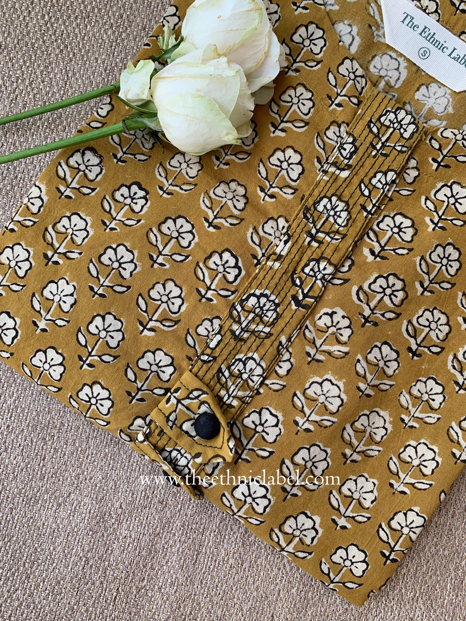 Crafted in pure cotton, our kurtas feature timeless hand block prints inspired by age-old artistry. Each piece carries unique motifs stamped by skilled artisans. Comfortable yet elegant, they are perfect for everyday wear with a touch of heritage.This kurta adorns a unique buttoned style adding to its charm.