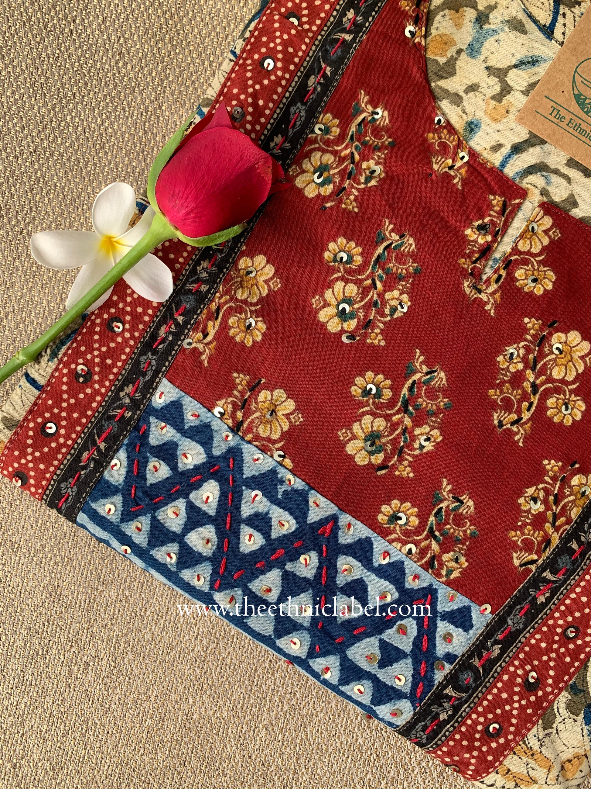 Step into comfort and style with our premium cotton kurta, thoughtfully designed for your everyday wardrobe. Crafted from the finest quality cotton, this kurta is soft, breathable, and perfect for all-day wear.The kurta has a unique kalamkari print with patch work and unique hand embroidery.