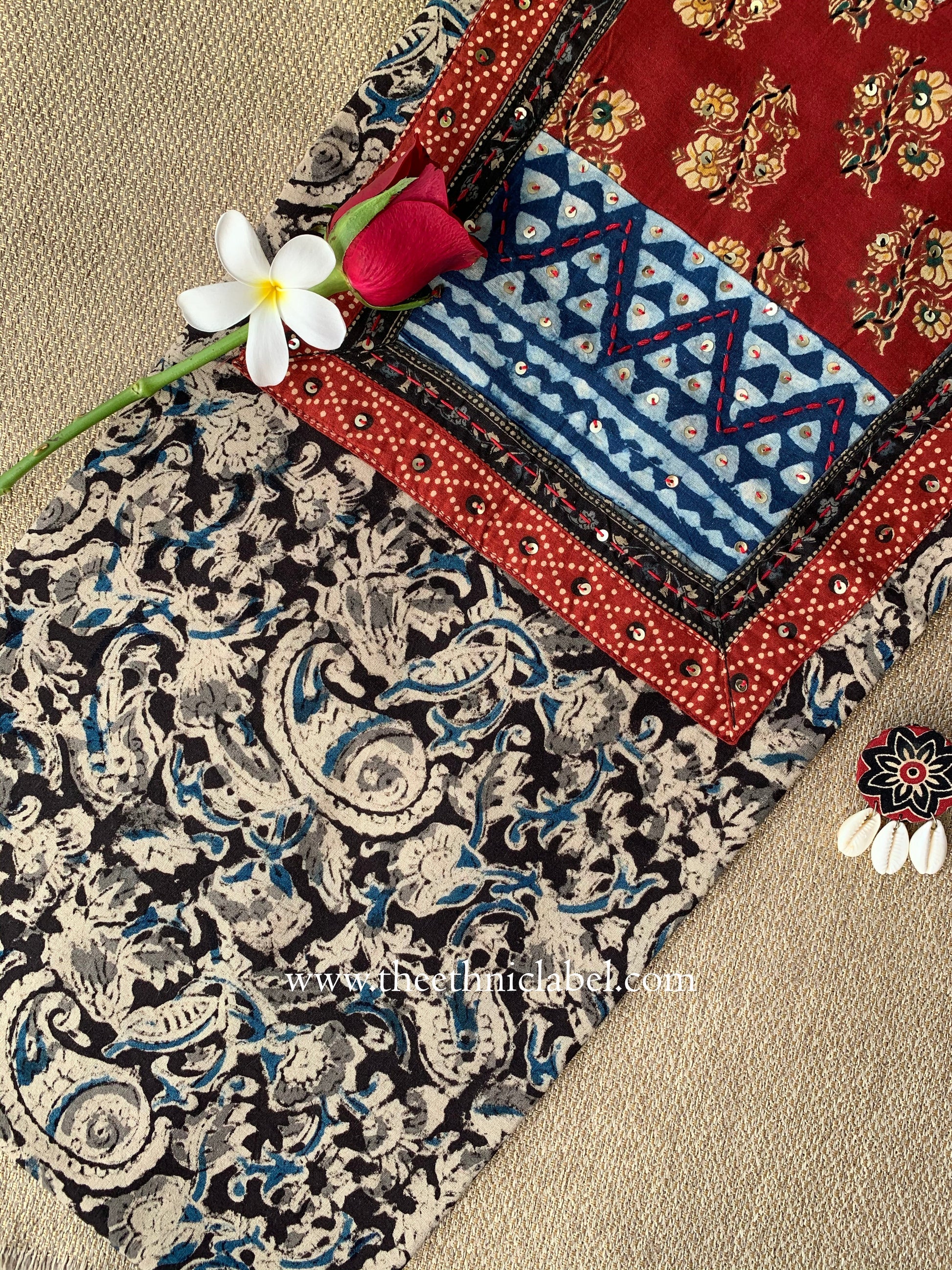 Step into comfort and style with our premium cotton kurta, thoughtfully designed for your everyday wardrobe. Crafted from the finest quality cotton, this kurta is soft, breathable, and perfect for all-day wear.The kurta has a unique kalamkari print with patch work and unique hand embroidery.